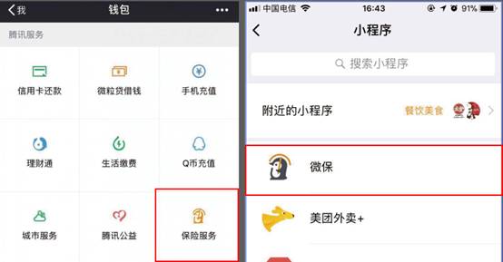 腾讯不甘落后,微信上线保险服务。2017年10月,微民保险代理公司获批,这是腾讯旗下的首张代理牌照,至此,微信开通保险服务一事终于落地,不同于过去仅通过股权投资入股保险公司,此次腾讯是真枪实弹地卖保险。时隔1个月后的11月2日,腾讯发布保险平台——微民保险,用户可以通过微信与QQ直接进行保险购买、查询以及理赔。另外,新版微信钱包的九宫格中已上线一项新业务——保险服务(图1)。