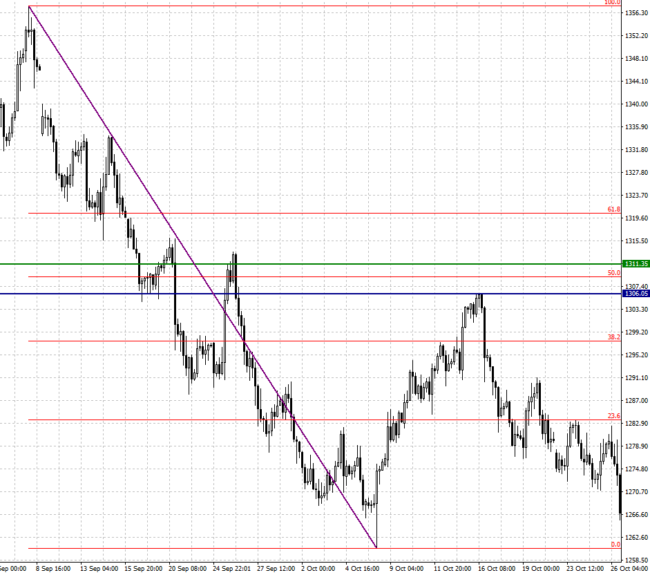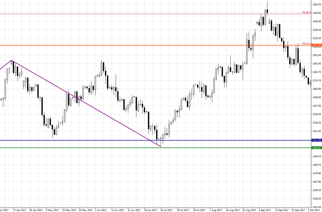 C. 下跌趋势: 2017年9月-10月,黄金4小时图 (50%及FE 61.8%)