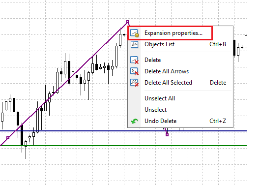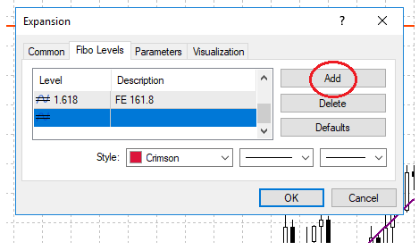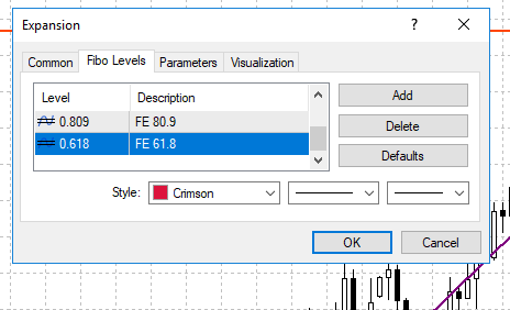 注意,在某些MT4平台上,“斐波那契扩展线” 起始时所带有的线组有可能不齐全,但其实可以手动加入。