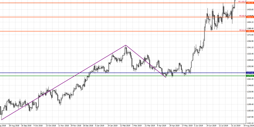 但假如我们勇于接受停损,亏损三次7美元 (1277买入,1270止损),即使最终我们在FE 61.8%的阻力线 (1381美元) 获利,我们仍可获利83美元。