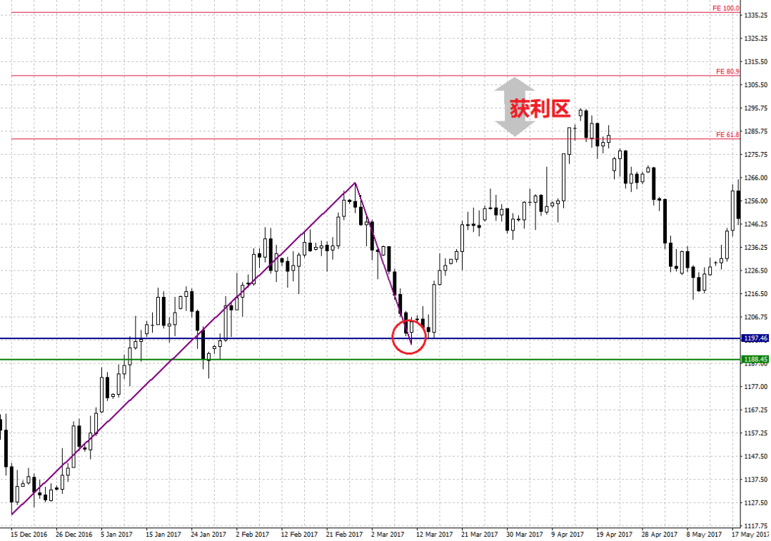 不同的是,除了拉出最高及最低点外,我们还要将第一个回调点确认好,即1197附近的最低点 (红圈)。
