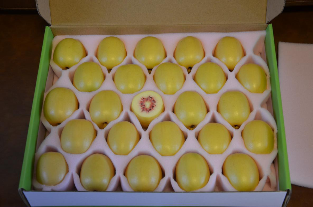 图为贫困户种出的红心猕猴桃出口产品——有机红收果