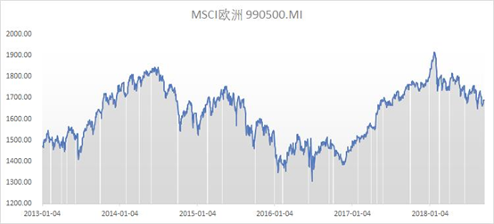 再来看看欧洲市场的具体情况。基金招募书显示,该基金的业绩比较基准为90%×MSCI 欧洲净收益指数收益率+10%×税后银行活期存款收益率。下面为MSCI欧洲指数近五年的走势情况: