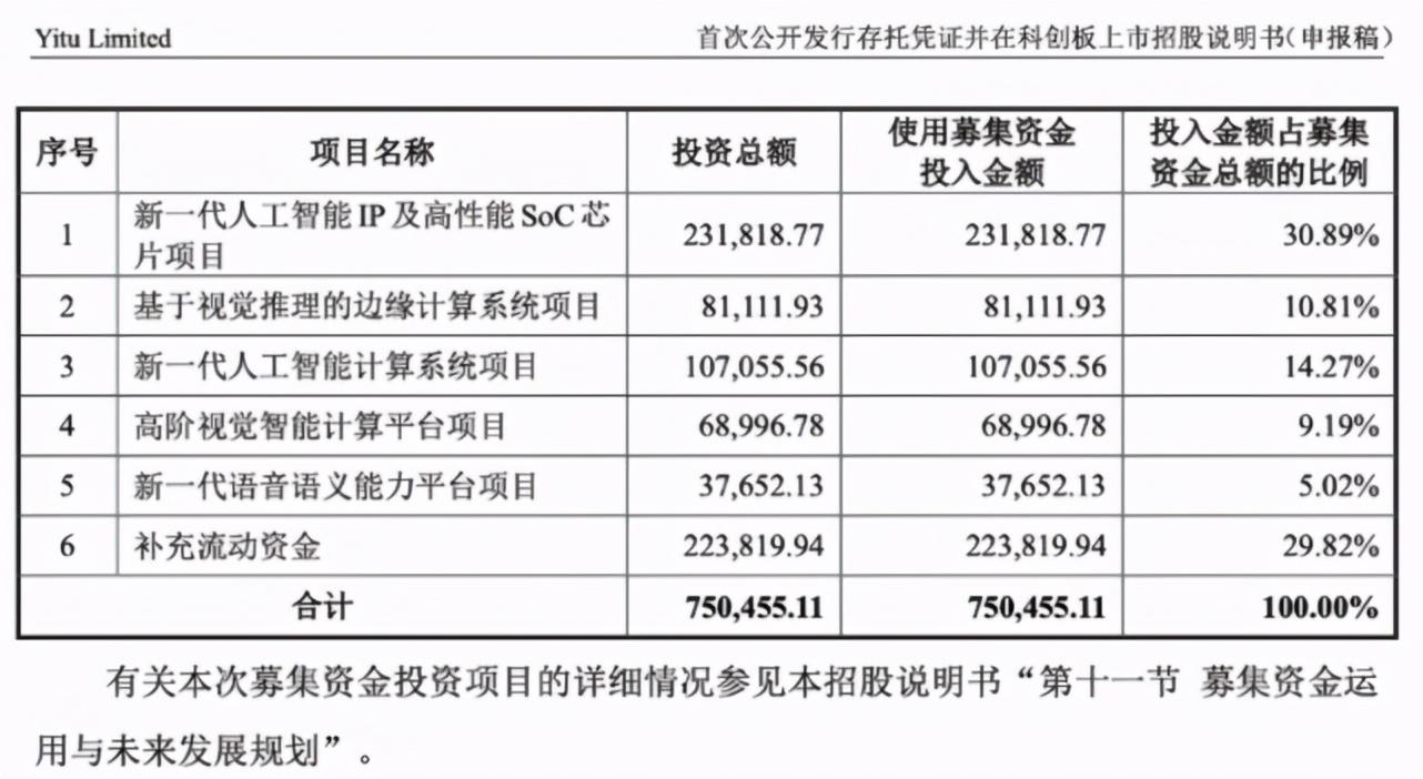 AI 芯片也是依图未来重点研发项目,招股书显示,新一代人工智能 IP 及高性能 Soc 芯片项目投资总额预计达 23 亿,投入金额占募集资金总额的比例 30.89%。