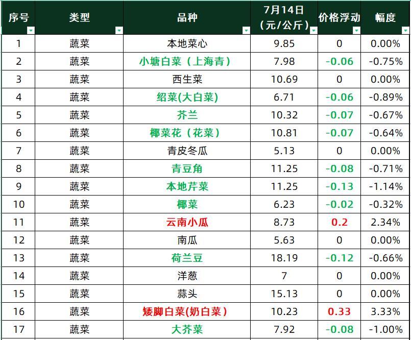 共计15个品种降价,其中生菜降幅最高,达2.44%。