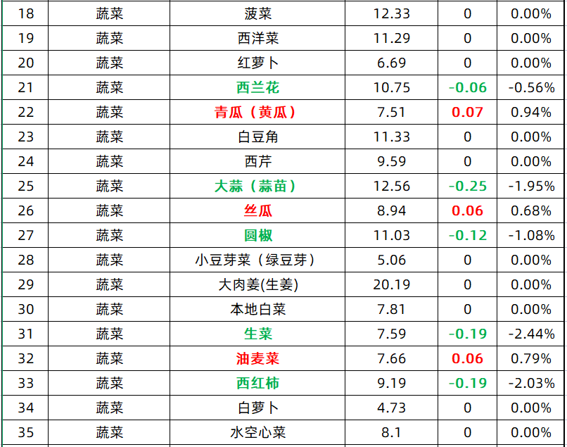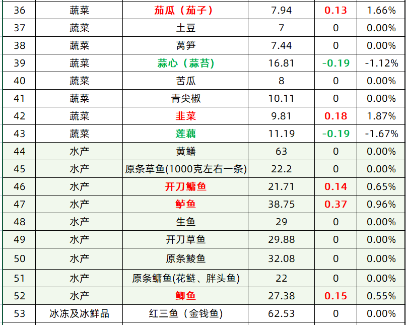 今日价格变动涉及蔬菜和水产。
