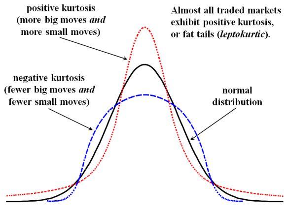 每一个波动率微笑都对应了标的资产价格走势的一种概率分布,这一概率分布也称为隐含概率分布。说到概率分布,我们首先要了解峰度和偏度。在正峰度曲线下,标的资产价格落在最左边(暴跌)、最右边(暴涨)和正中间(不动)的概率比正态分布的要大,而在相对中间位置(小涨小跌)的概率要小。这意味着在正峰度分布下,标的资产价格发生大涨、大跌或者非常小的波动的可能更大,而发生中等波动的可能性更小。负峰度则刚好相反,相对于比正态分布,该分布具有更轻的尾部和更平坦的峰值,标的资产发生大涨、大跌或者非常小的波动的可能性较小。下图形象的展示了以上的描述: