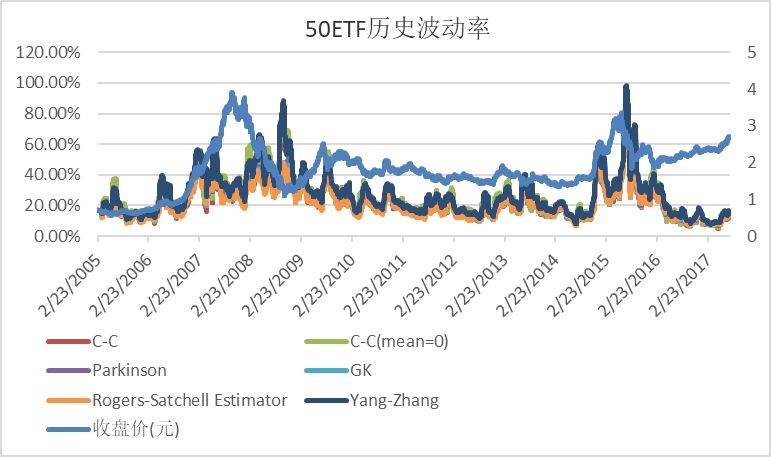下图为不同历史波动率估计量下,50ETF自上市以来的几种历史波动率。