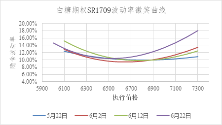 为了形象地说明这一点,我们随机选取了四个交易日,以2017年9月到期、行权价格不同的白糖期权为例,画出了隐含波动率和执行价格的关系曲线(即波动率微笑)。可以看到,曲线两边高中间低,是不是很像一个嘴角微微上扬的smile呢~