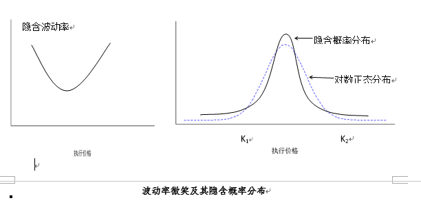 我们假设现在有一个执行价格为K1的深度虚值看跌期权,这意味着只有当标的资产的价格低于K1时,该期权到期才会带来收益。我们来看右侧的图,隐含概率分布与对数正态分布相比具有更大的峰度,所以在隐含概率分布下,标的资产价格小于K1的概率比对数正态分布大(简单理解,在K1左侧,隐含概率分布曲线下的面积比对数分布曲线下的面积更大)。由于标的资产服从对数正态分布是BS模型的基本假设,所以,由隐含分布得到的价格就会比BS模型得到的理论价偏高,从而期权的隐含波动率也会偏高。