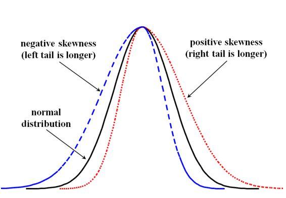我们再来看一个图,下图由一个正态分布曲线(实线)、一个具有正偏度的分布曲线(右侧曲线)和一个具有负偏度的分布曲线(左侧曲线)组成。