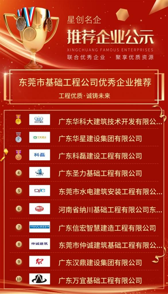 【星创名企-优秀企业推荐】为了促进企业健康发展,发挥优秀企业在行业内的领导作用,首选好商家旗下所属的的综合性企业服务平台——“星创名企”,凭借其专业领先的技术实力,公平公正的活动原则,全力策划发起了由中国各省市优秀企业商家参与的“星创名企”优秀企业推荐活动,此项活动旨在将我国各个行业内的优秀企业汇集在一起,通过征集广大网友对企业支持数据,选出了东莞市基础工程公司优秀企业,现将对征选结果予以公示: