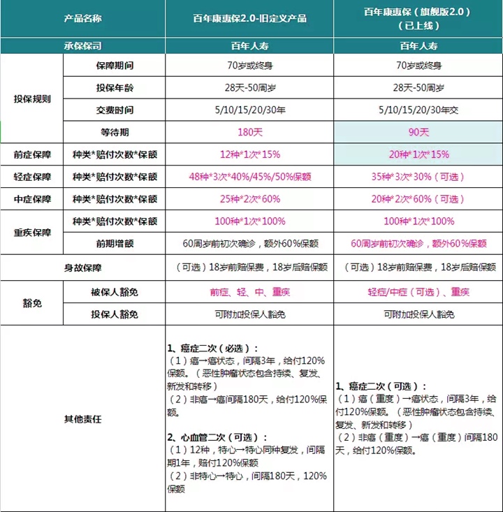 1)甲癌和轻症赔付比例的调整都按照了新定义的标准规定,这个区别跟上个产品是一样的。 同样,把原位癌纳入到了轻症中,值得肯定。 2)除了新定义引起的差异外,简直可以用像素级拷贝来形容这个新品。 主要差异就2点,还都是可选责任:癌症赔付津贴从30%,最多3年升级到了40%,最多3年,保障升级;