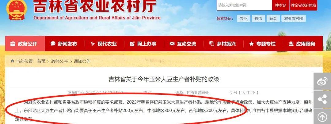 官方最新公告显示,2023年,吉林省境内大豆生产者补贴亩均要高于玉米生产者补贴220——320元左右;
