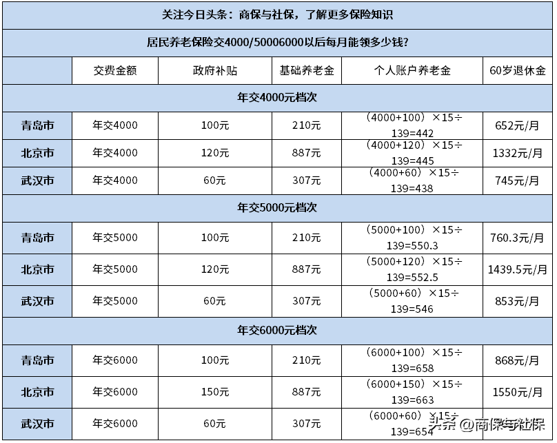 1、选择年交4000档次,交15年退休,在青岛、北京和武汉退休,分别可以每个月拿到652元/月、1332元/月、745元/月