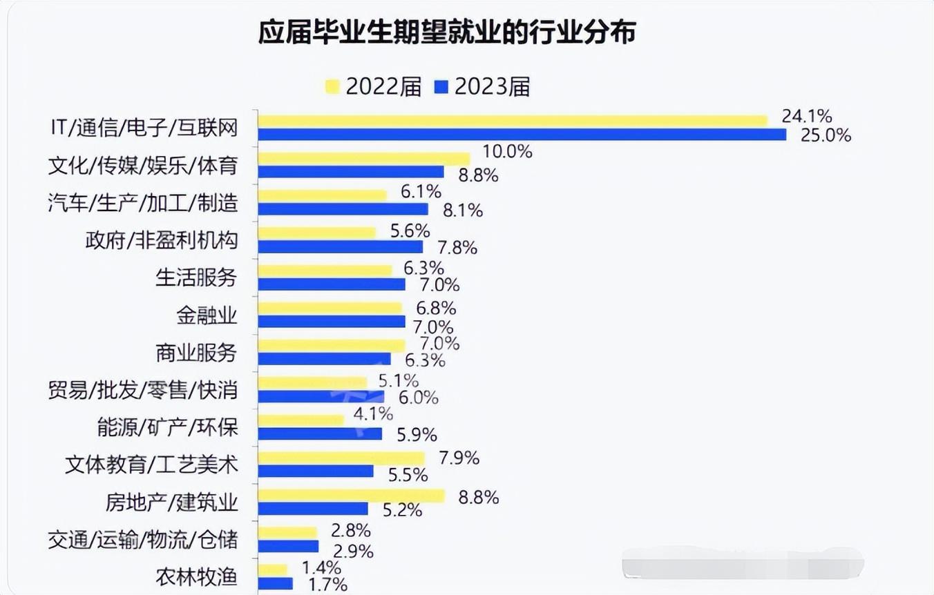 在关于2023届毕业生期望进入的就业行业调查中,发现和2022届毕业生相比是有不同的,