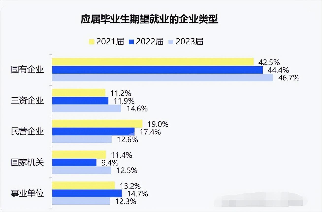 毕业生就业求稳是连着3年都保持上升的状态,2023届毕业生就业求稳的心态有多明显,从其就业偏好的企业类型就可以看出来。