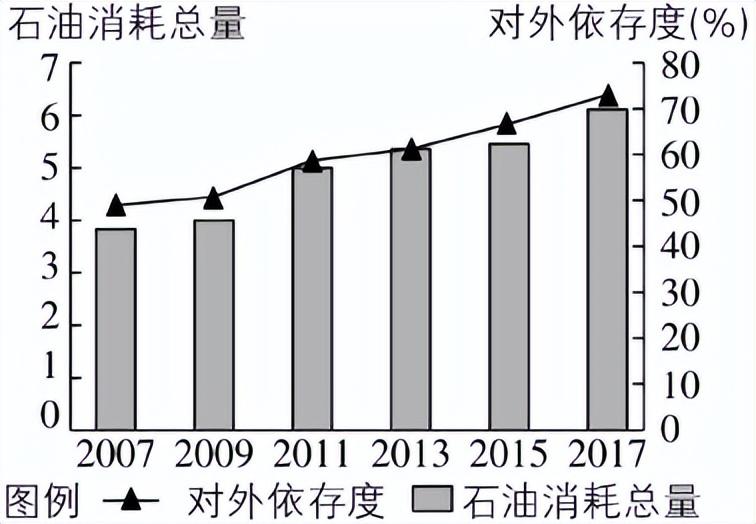 下图为我国2007~2017年石油消耗总量和对外依存度(石油净进口量/石油消耗总量×100%)统计图。据此完成下列问题。