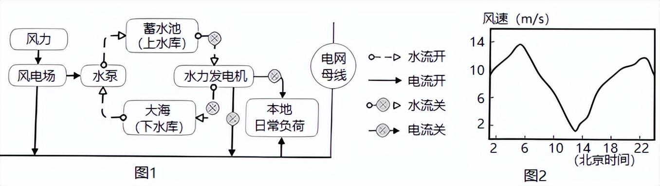 1. 由图示信息可知,此时风力发电正常,水力发电暂停。风力发电厂产生的能量用于水泵抽水,将下水库的水抽到上水库。此工作状态最可能出现在本地日常负荷较小,即用电量较小,且风力发电量强,即风速大的时间段。结合图 2 可知, 2 点至 4 点风力较强,且此时用电量较小, A 正确。 12 点至 14 点风速较小,风力发电量小, B 错误。 17 点至 19 点、 20 点至 22 点用电量较大, CD 错误。故选 A 。