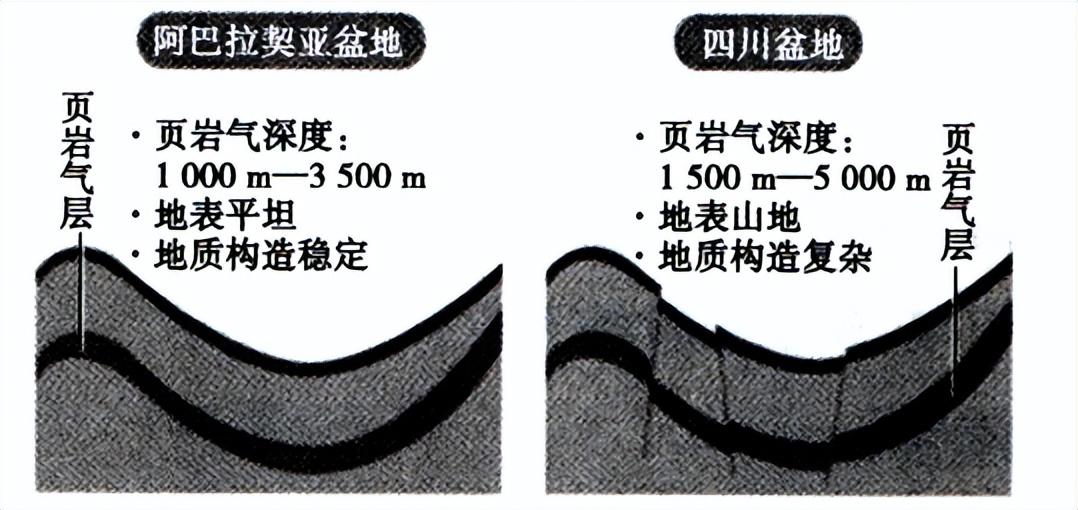 对比两图可知,四川盆地页岩气埋藏深度为1500—5000m,比美国阿巴拉契亚盆地页岩气埋藏深,开采的工程量更大