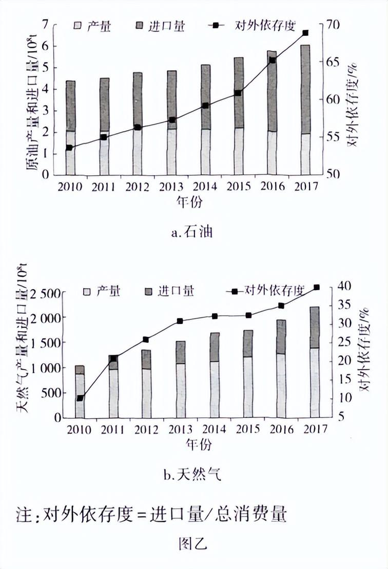 图甲为“2016年世界与中国能源消费结构对比图”,图乙为“中国石油、天然气的产量、进口量和对外依存度图”。读图,回答下题。