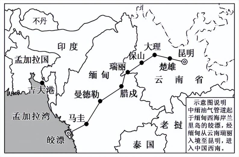 为保障我国能源供应安全,我国不断拓展能源进口渠道,2017年5月16日,我国第四条能源进口通道(中缅油气管道)正式开始输油。据此回答下面题。
