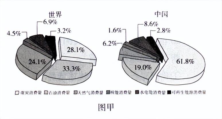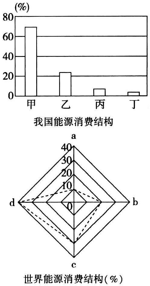 我国既是能源生产大国,又是能源消费大国,但每吨标准煤的产出效率仅相当于日本的10.3%、欧盟的16.8%、美国的28.6%。读“某年我国和世界能源消费结构图(甲、乙、丙、丁分别对应煤、石油、其他能源和天然气)”,完成下面三题。