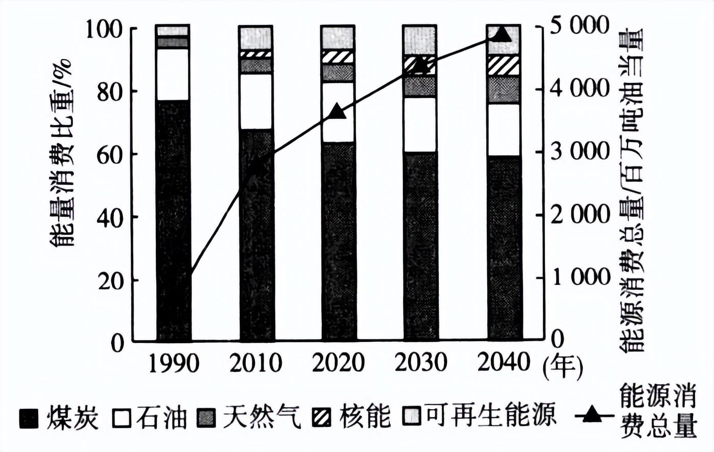 下图是我国1990—2040年能源消费结构和能源消费总量的变化(含预测)图。读图,回答下列问题