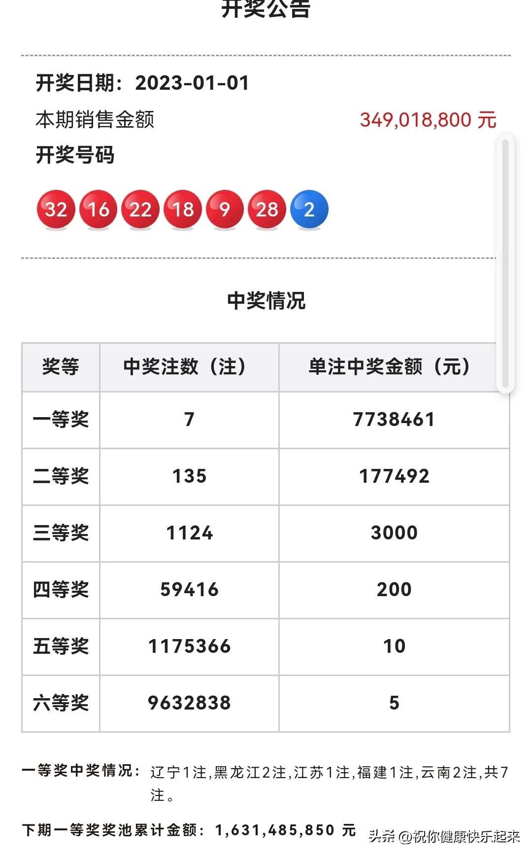 一等奖开出7注,奖金7738461元,辽宁1注,黑龙江2注,江苏1注,福建1注,云南2注,恭喜他们。