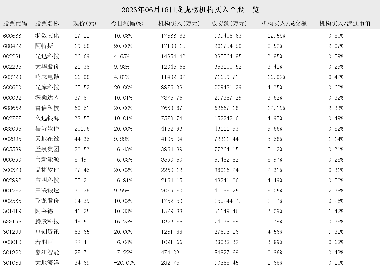 2023年06月16日盘后龙虎榜公开信息中,有46支股票出现了机构的身影。其中,有23支股票出现了机构买入,23支股票出现了机构卖出。